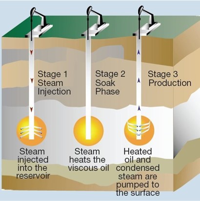 The well heads where CSS application are used are thermally completed capable of resisting the high pressure and high temperature steam. The injection phase into the well continues for about 14 to 21 days based on reservoir injectivity. The well is then shut in for a few days approximately 50% of injection days whereby the heat content of the steam is allowed to soak in the producing formation around the well bore. The steam temperature heats the formation & reservoir fluid around the well bore which in turn reduces the viscosity of the oil and enhances its mobility and production. The well is then put on production phase. Initially the well flows self and when the flow ceases SRP surface unit is installed to recover the stimulated fluid. The production phase continues till the stimulated fluids are produced and when the well returns to its cold production level, the next cycle of CSS begins. The cycle of soak- and-produce, or "Huff-and-Puff" is repeated till the cycle reaches its economic limit.